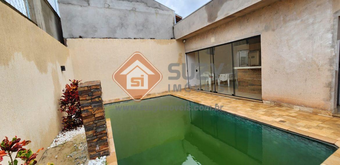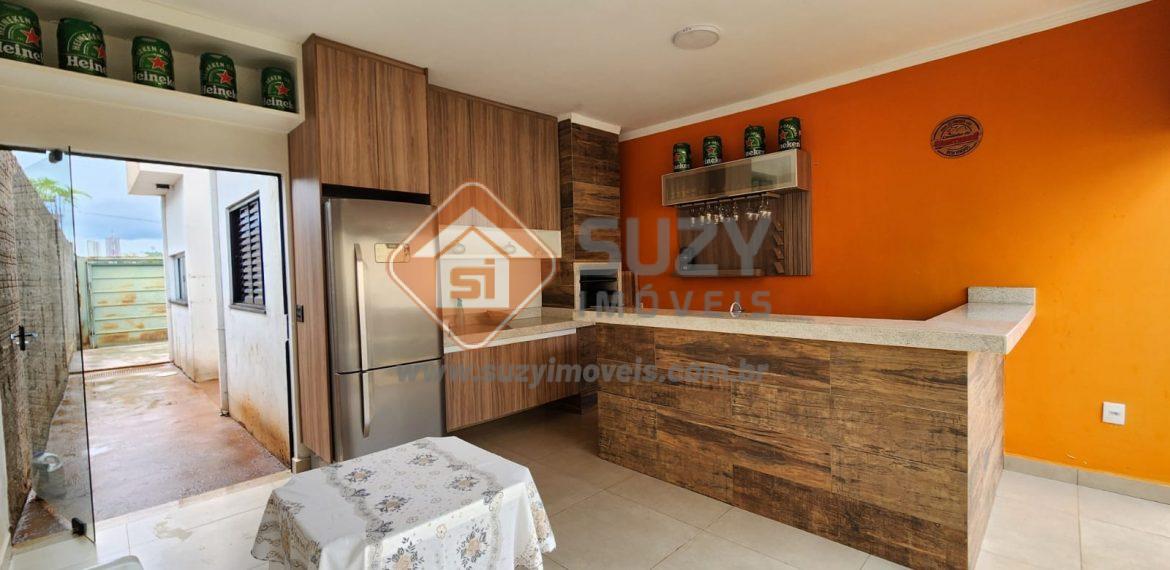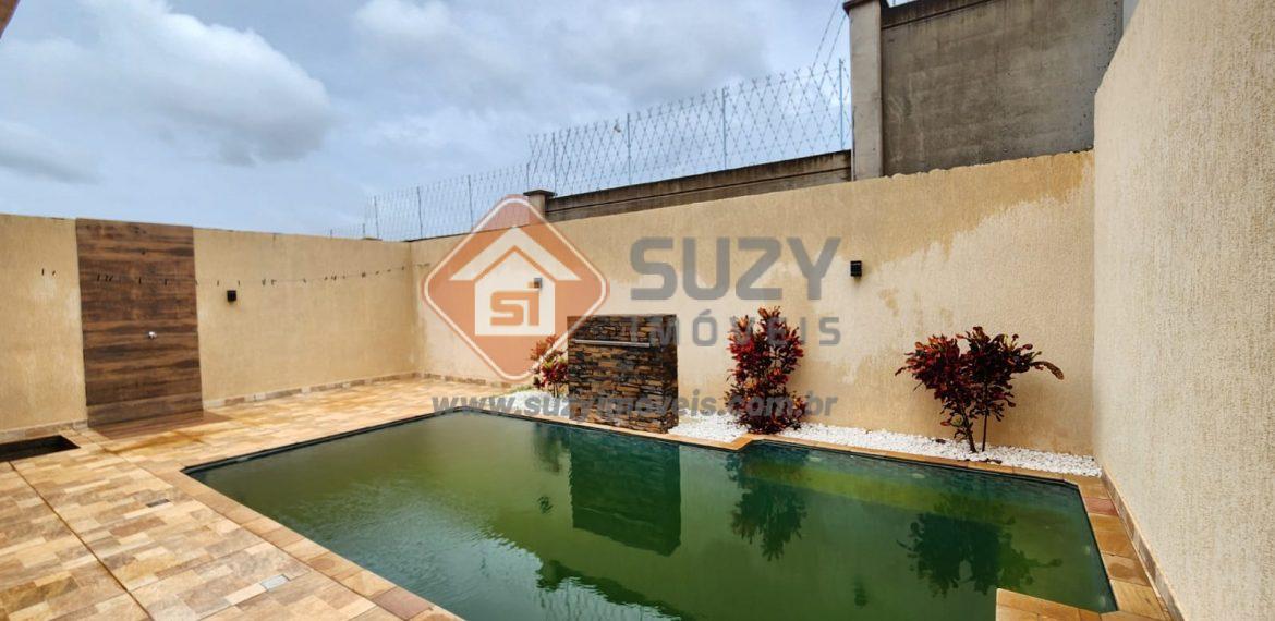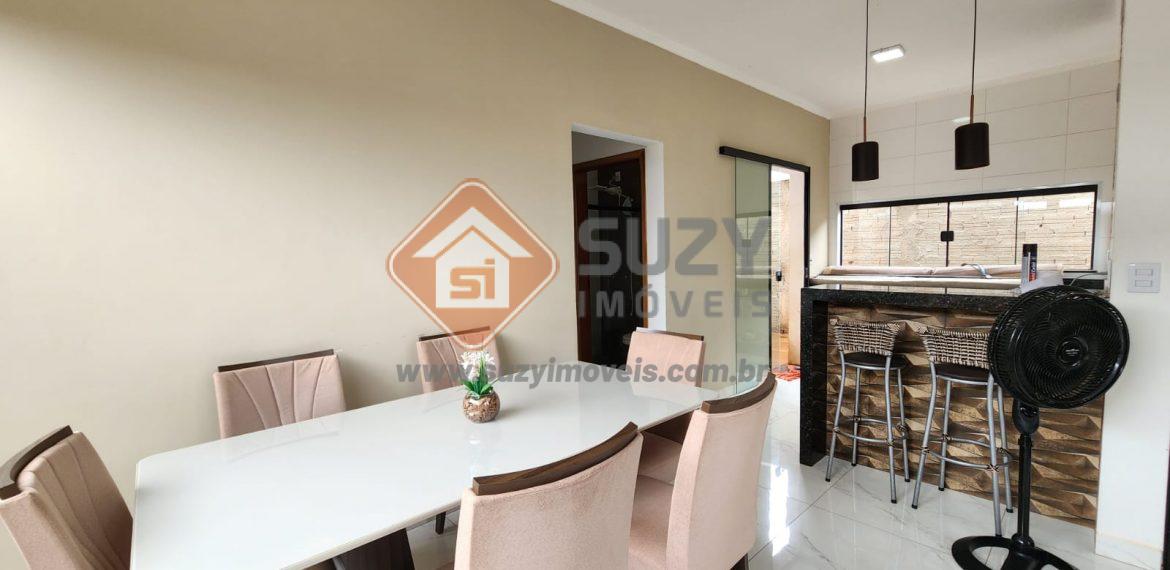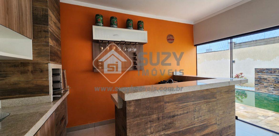 03 dormitórios sendo 01 suíte, w.c social, sala de visitas, sala de jantar com cozinha americana com cooktop, balcão, área de serviço, linda área gourmet com churrasqueira  fechada com vidro, balcão, armários, w.c externo, piscina, quintal, garagem descoberta para 03 carros.