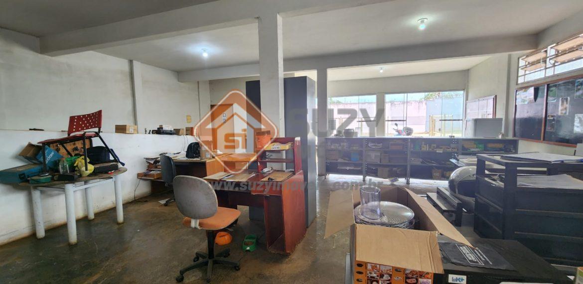 Barracão comercial, com escritório, mezanino com w.c para depósito, 04 w.cs (02 feminino e masculino adaptados), frente com garagem para 03 carros.