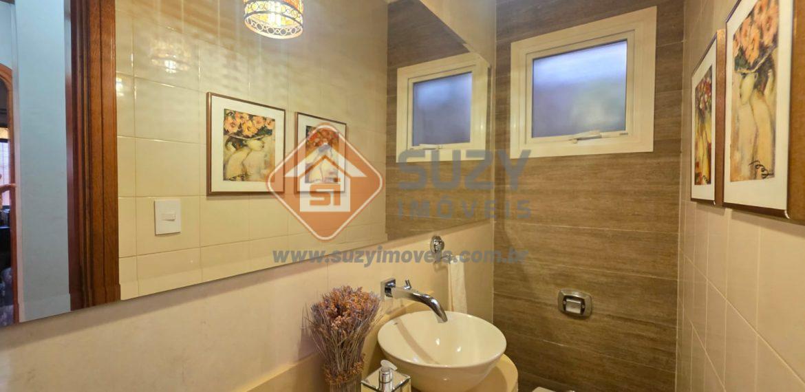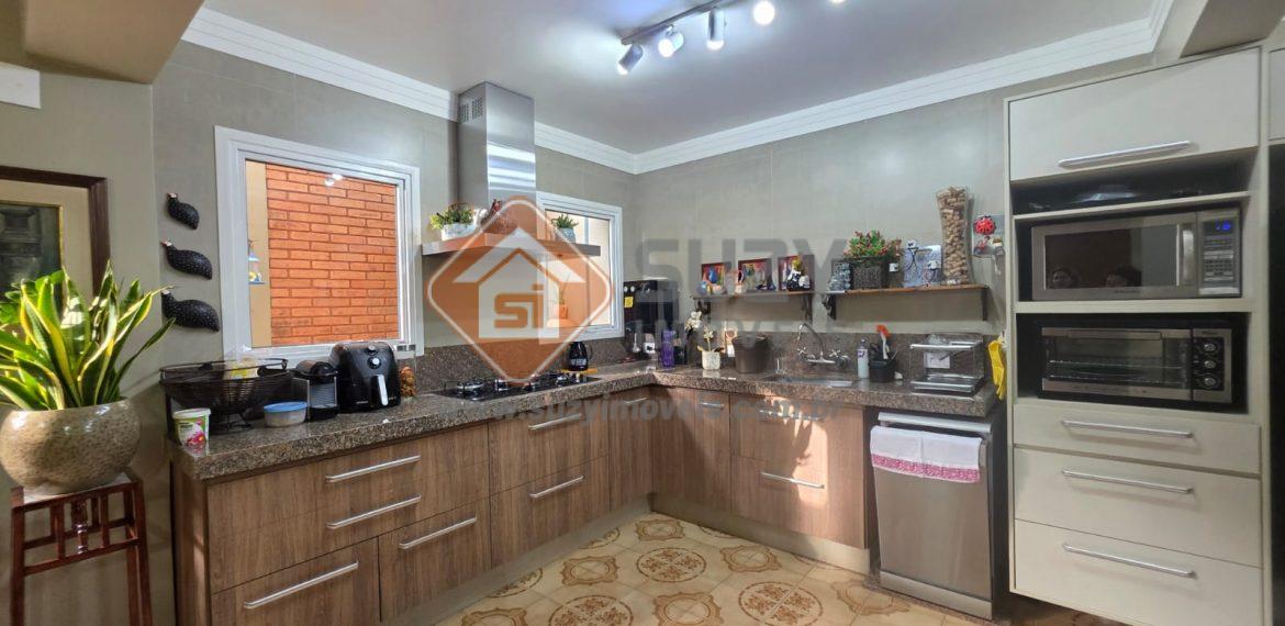 Piso térreo  – hall de entrada, lavabo, sala de estar com ar condicionado, sala de jantar, cozinha completa com armários planejados, cooktop, coifa, torre quente, copa com cristaleira, w.c social, corredor com jardim, garagem para 03 carros cobertos e 01 fora da cobertura, energia solar